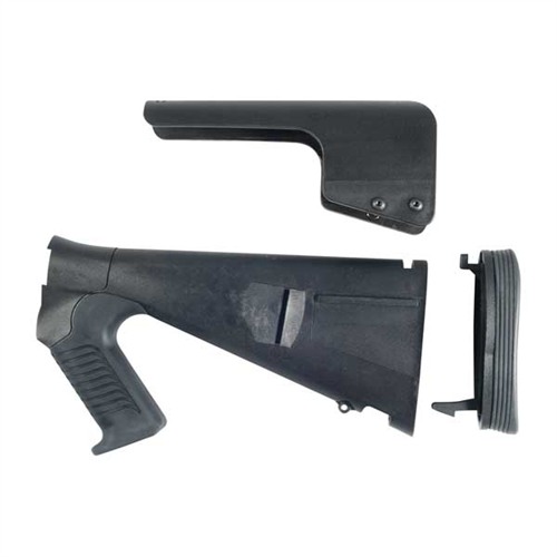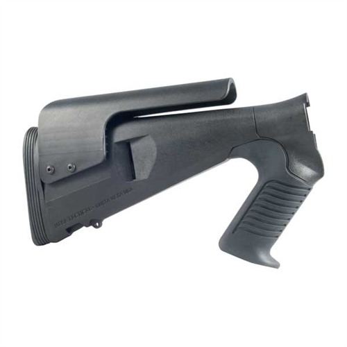 Pistolgrepstokken av robust, fiberglassforsterket nylonpolymer har en kort lengde på 12½" (31,7 cm) som gjør det enkelt å skyte og manøvrere når du har på deg kroppspanser. Den avtagbare, fem-posisjons kinnstøtten hjelper deg med å plassere hodet for best mulig justering med en optikk, samtidig som du opprettholder et solid kinnkontakt.