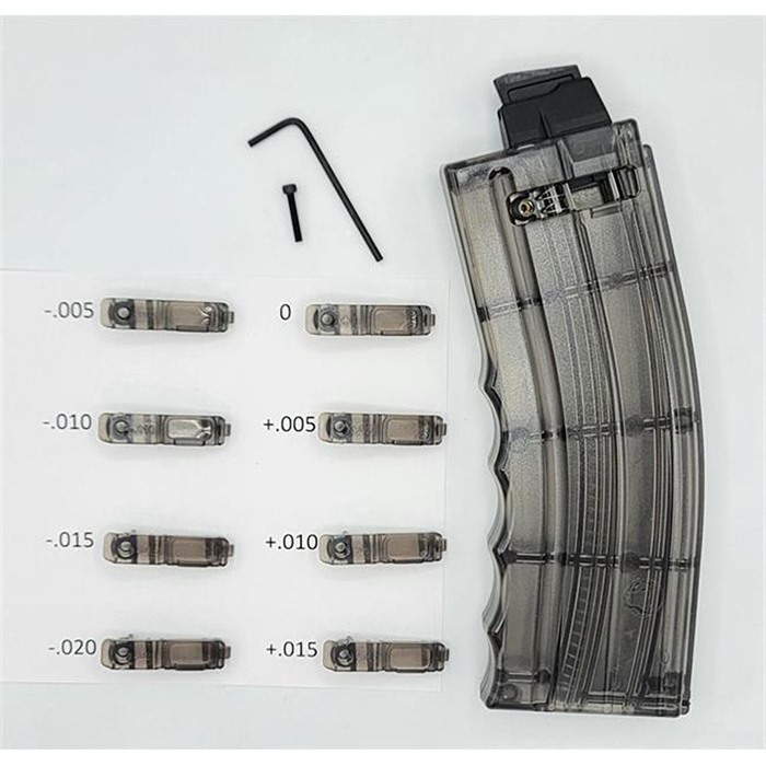 Det nye magasinet har åtte hurtigskiftende innsatser der låsepunktet er plassert. Ved å bruke den medfølgende 3/32 allen-nøkkelen, kan du fjerne én skrue for å endre innsatser opp eller ned i .005-incrementer for å finjustere ønsket matinghøyde for det enkelte sett eller våpen.