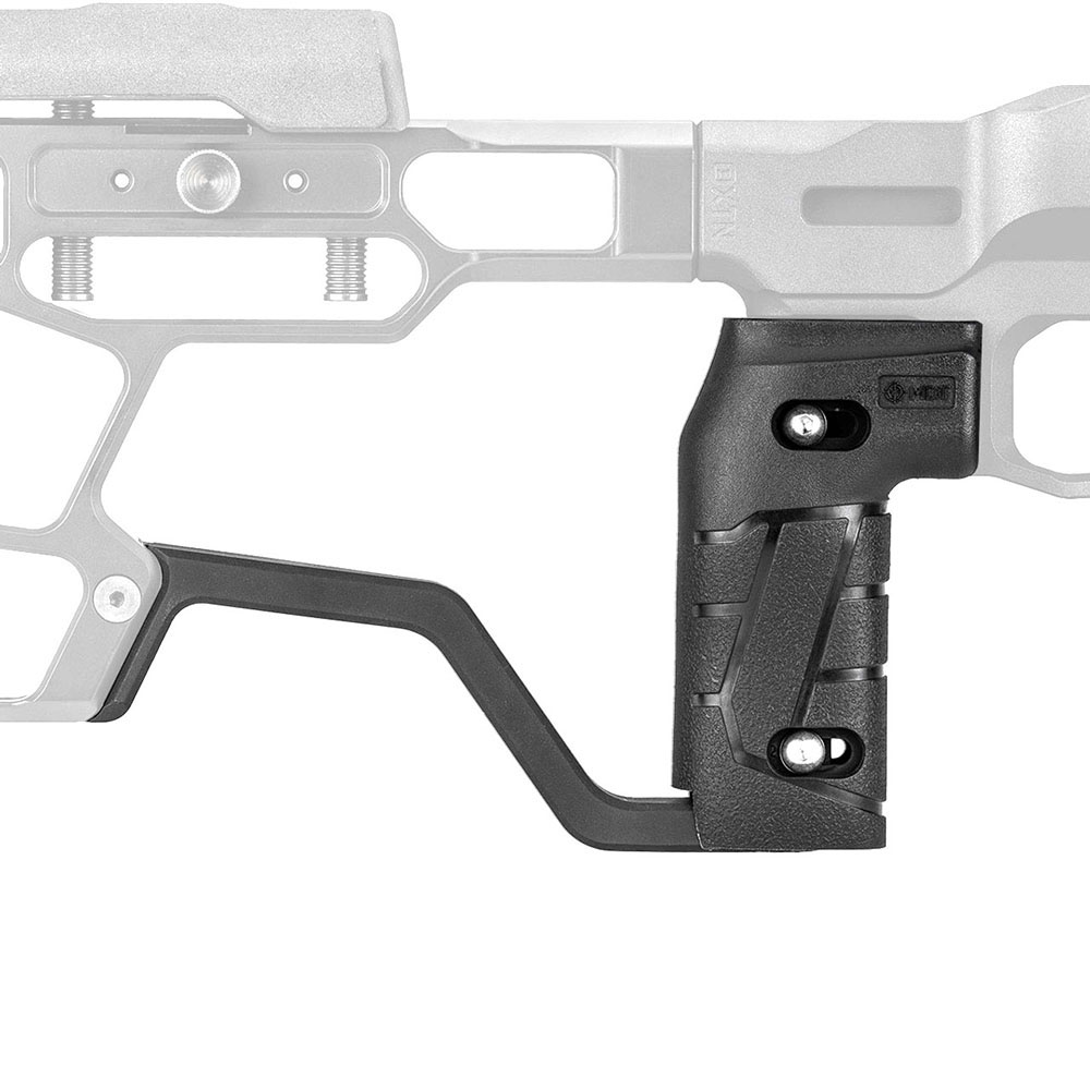 MDT Vertical Grip - Premier med Connector Bar gir mulighet for justering fram og tilbake, noe som tillater tilpasning for å passe enhver håndstørrelse og sikrer presis fingerplassering for presisjons skyting. Dens vertikale orientering fremmer en rett avtrekksbevegelse, noe som gjør den til et viktig tilbehør for dedikerte skyttere.