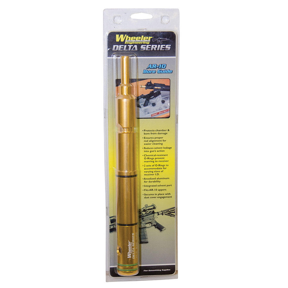 Wheeler Delta Series AR-10 Bore Guide er laget av presisjons CNC-maskinert aluminium og vil bidra til å beskytte bore og mekanisme på riflen din ved å justere rengjøringsstangen riktig og redusere overløp av løsemidler.