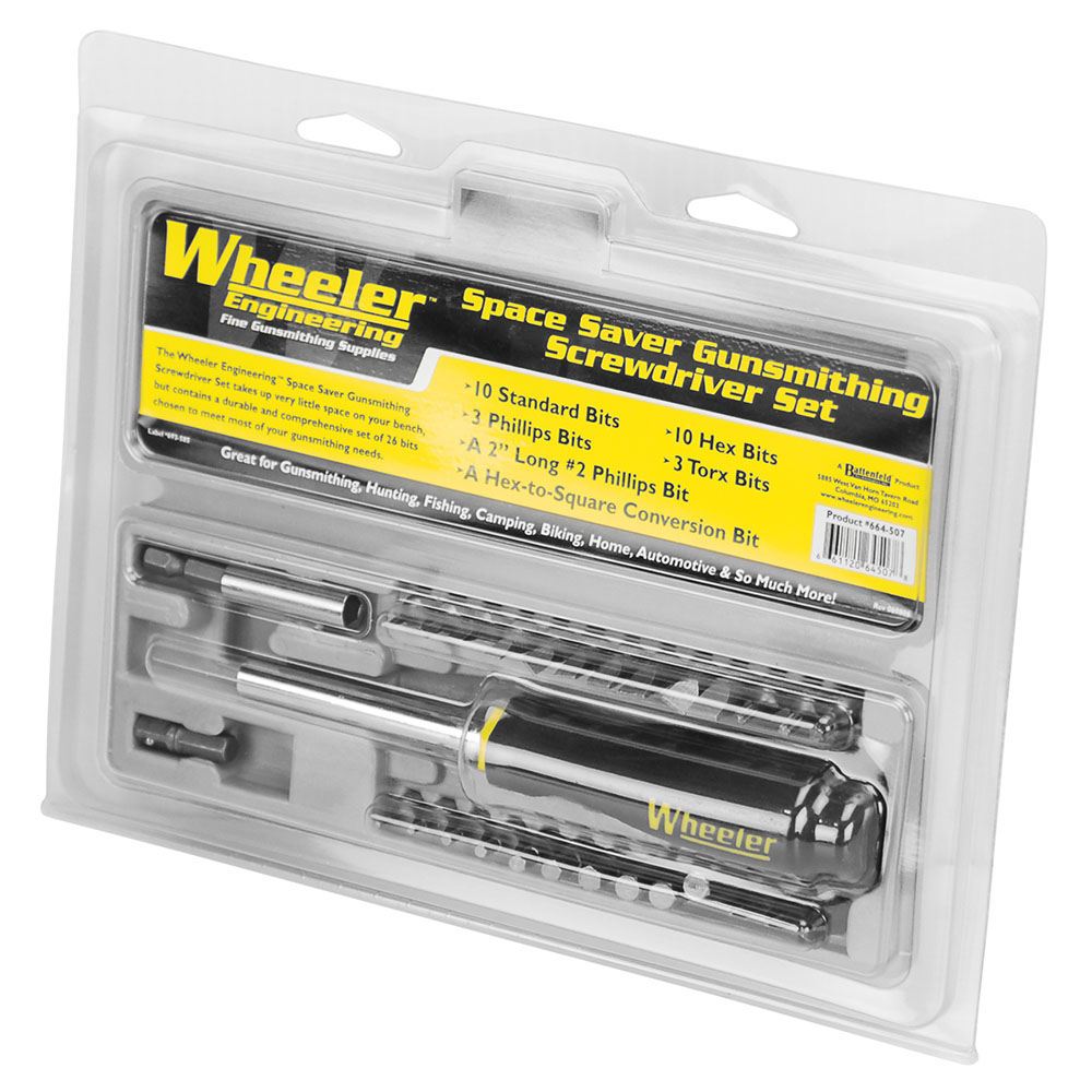 Wheeler® Space Saver Gunsmithing Screwdriver Set er mindre enn halvparten så stor som sammenlignbare skrutrekker-sett for våpensmeder, men inneholder et slitesterkt og omfattende sett med 26 bits som er valgt for å dekke de fleste av dine behov innen våpensmeding. Dette settet tar svært lite plass på arbeidsbenken din, og er også perfekt å ta med på turer til skytebanen eller i felten.