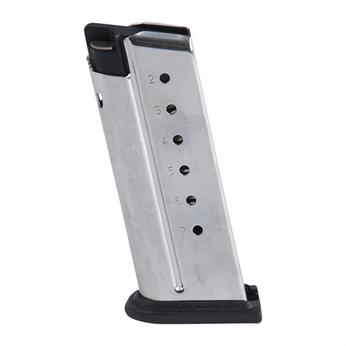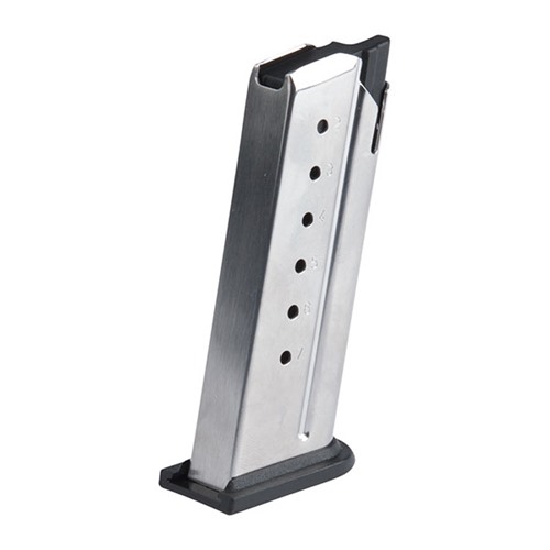 Magasinene har en formstøpt polymerfølger med en integrert stålplate som pålitelig løfter låsearmen på plass etter at siste skudd er avfyrt. Bunnplaten kan enkelt fjernes for rengjøring. 9mm 9-skudds og .45 ACP 7-skudds modeller inkluderer polymerdeksler som matcher begge bakstøttene som fulgte med din pistol.